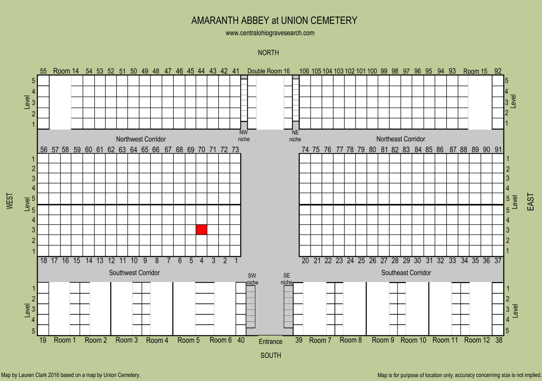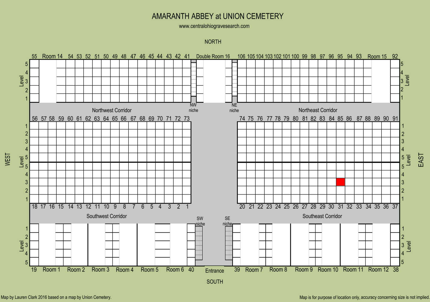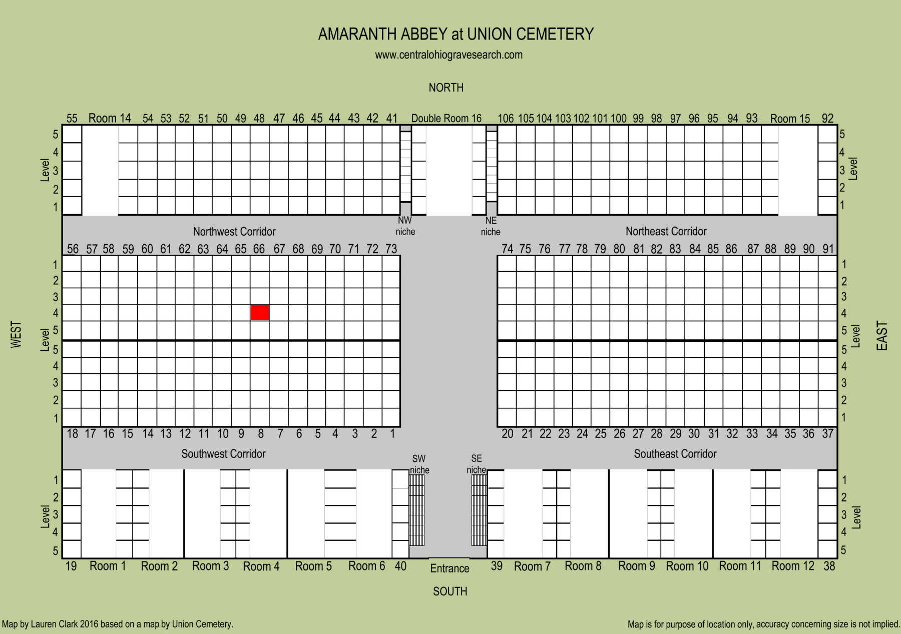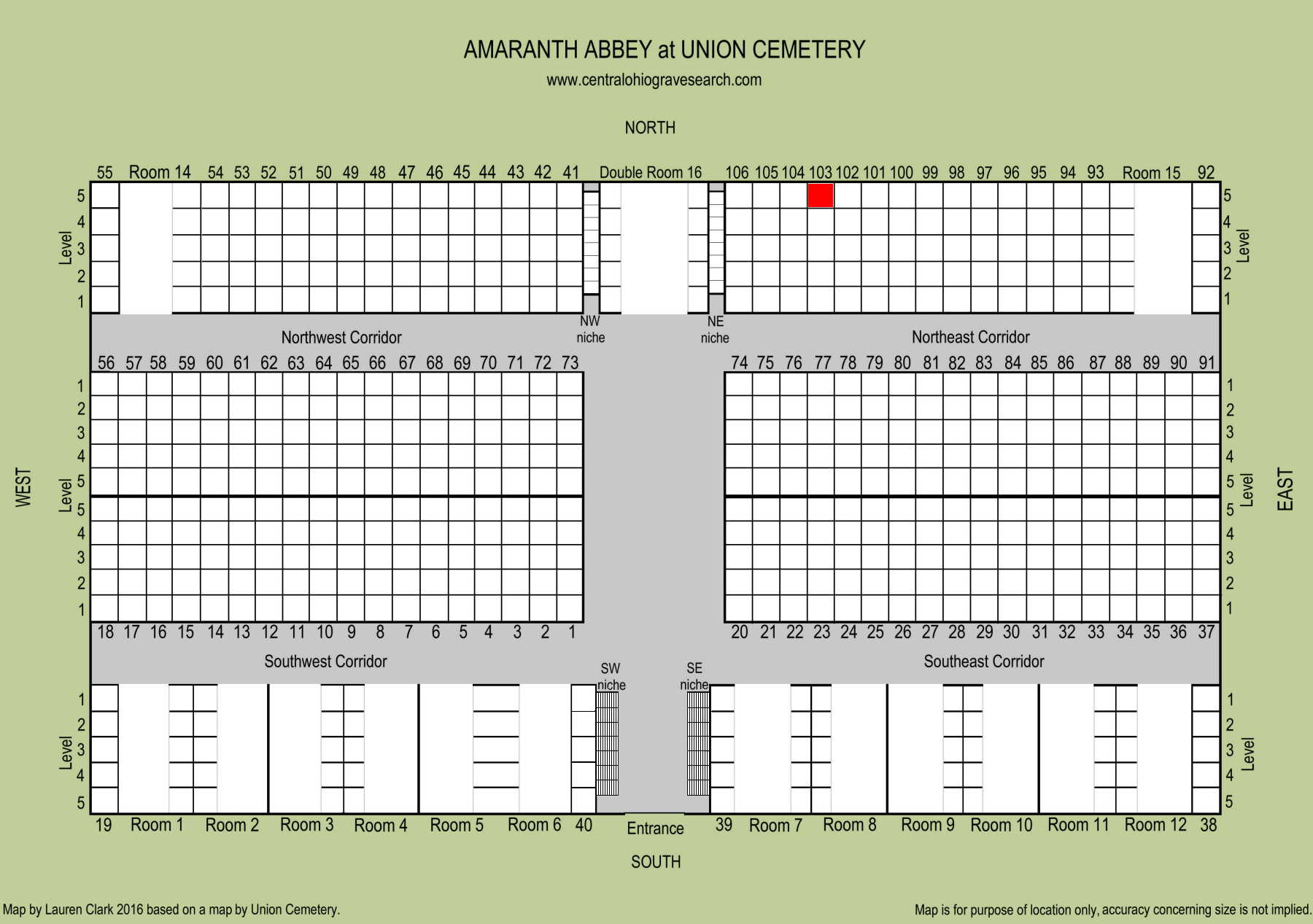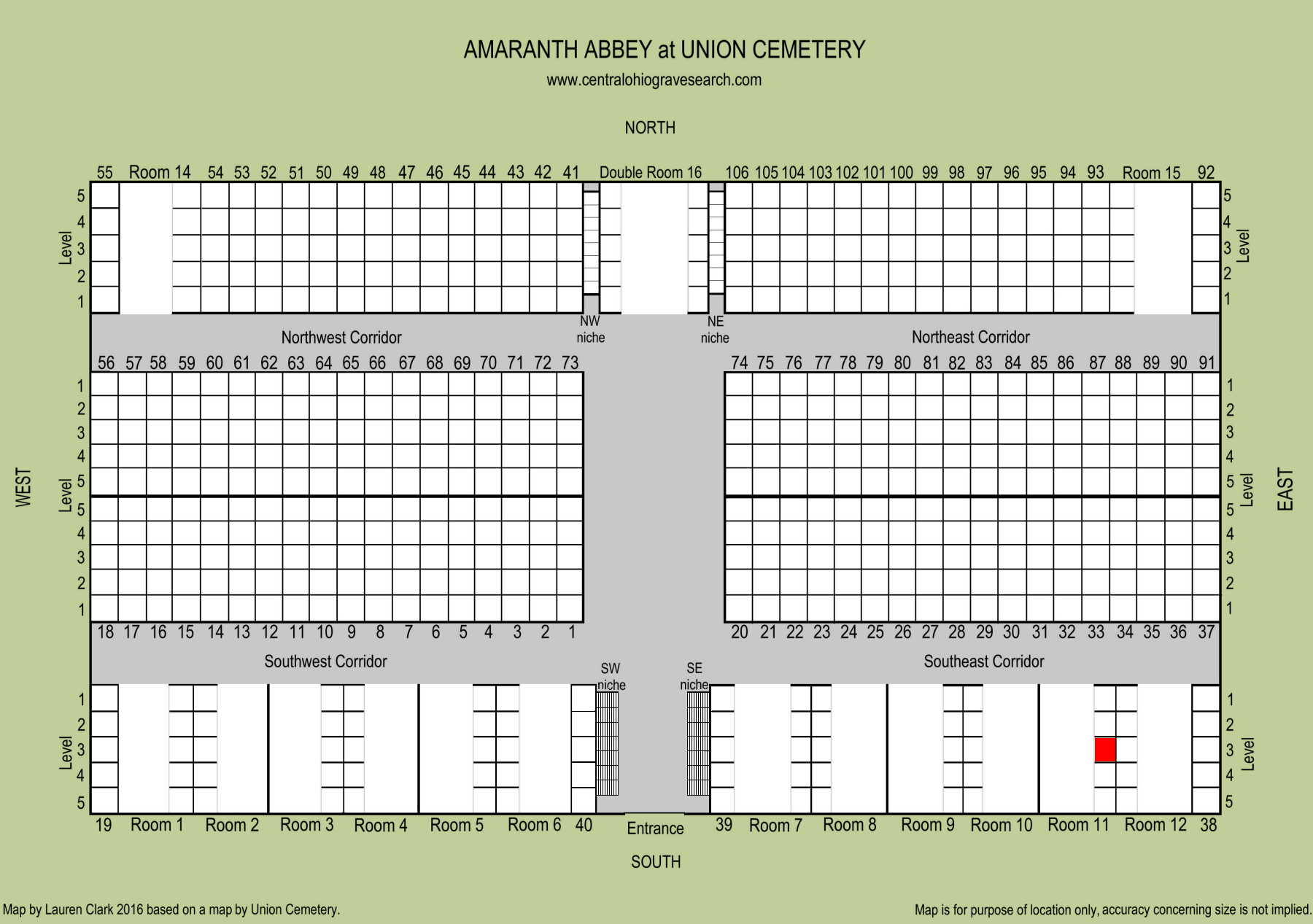 Union Cemetery Association "CIMS" computer printout of names and crypt/niche/room location for interments in Amaranth Abbey. This list represents what had been entered into the Union Cemetery office computer program as of 03 Nov 2014. This source is cited as Nov 2014 printout.
