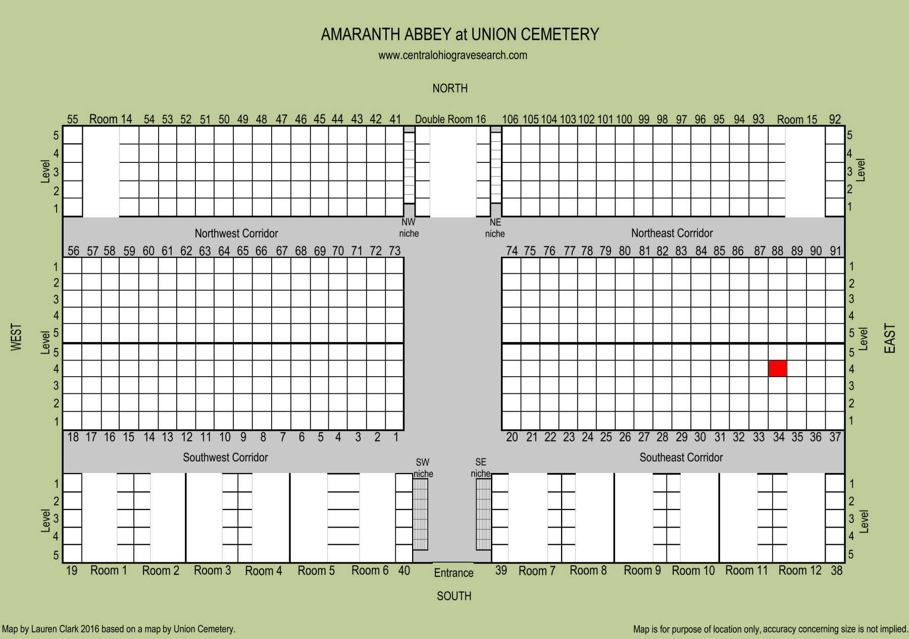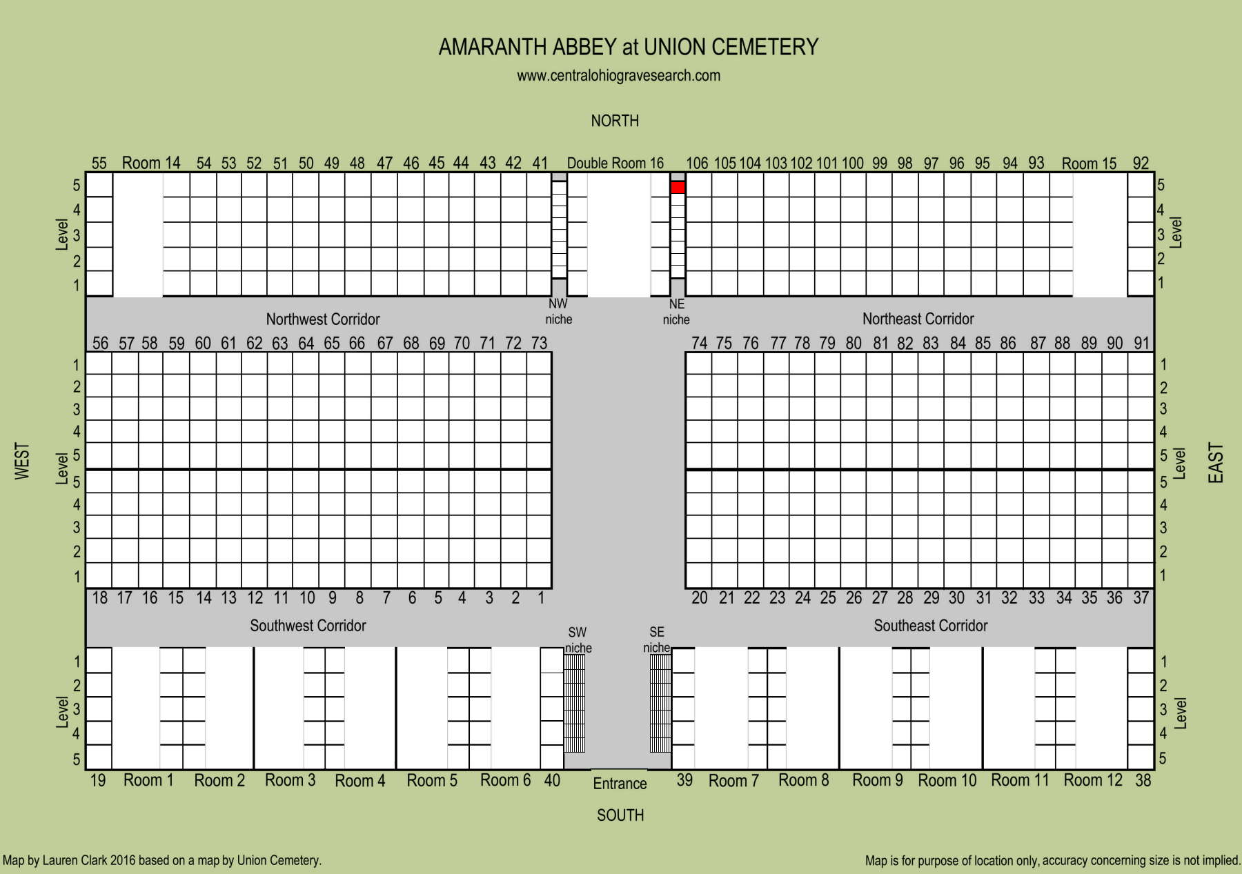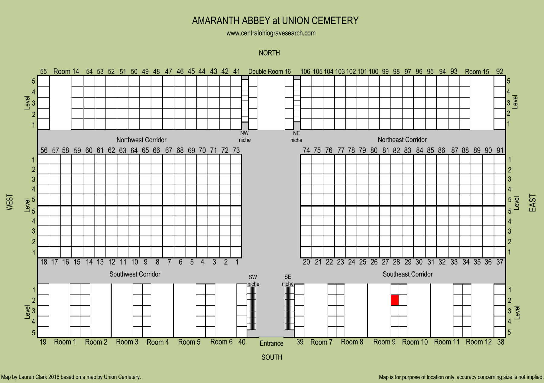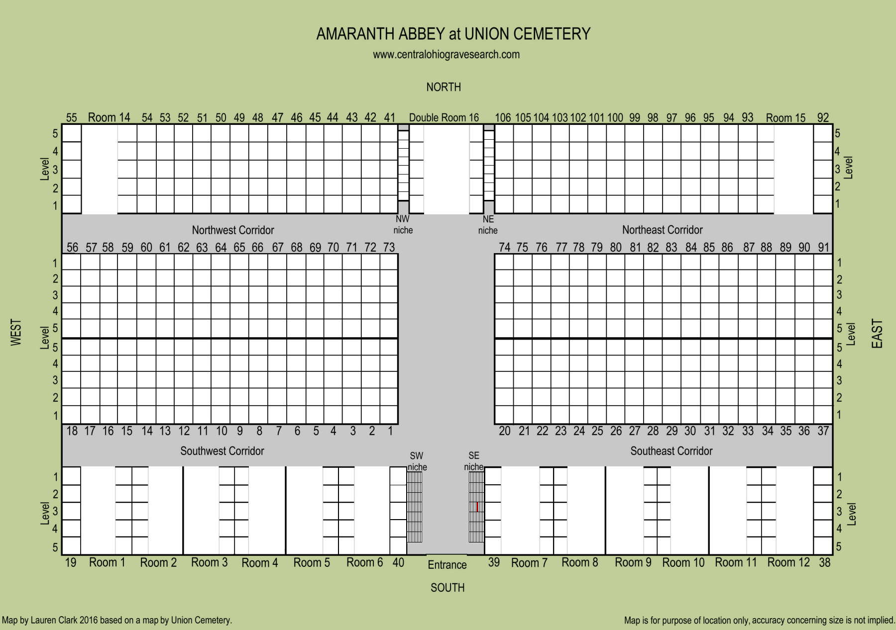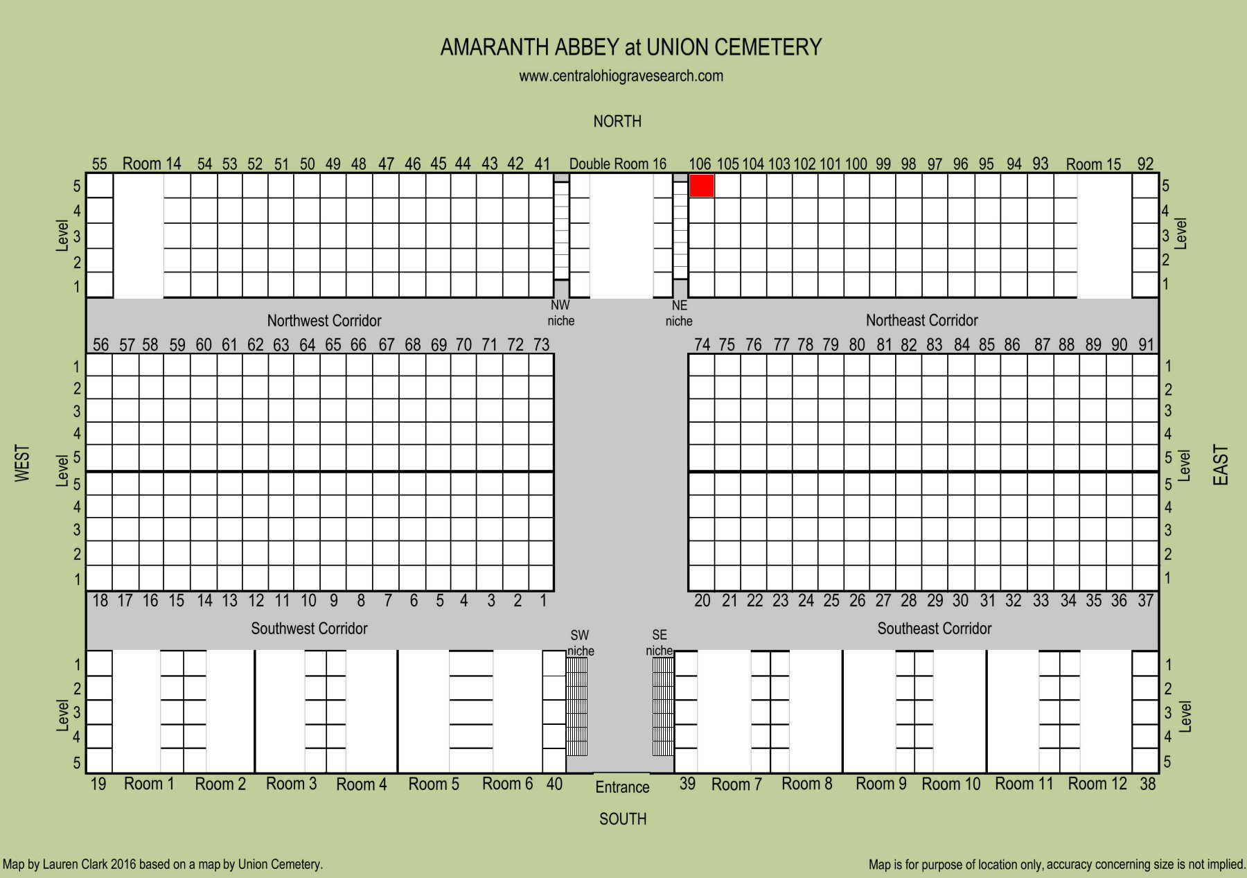 Union Cemetery Association "CIMS" computer printout of names and crypt/niche/room location for interments in Amaranth Abbey. This list represents what had been entered into the Union Cemetery office computer program as of 03 Nov 2014. This source is cited as Nov 2014 printout.