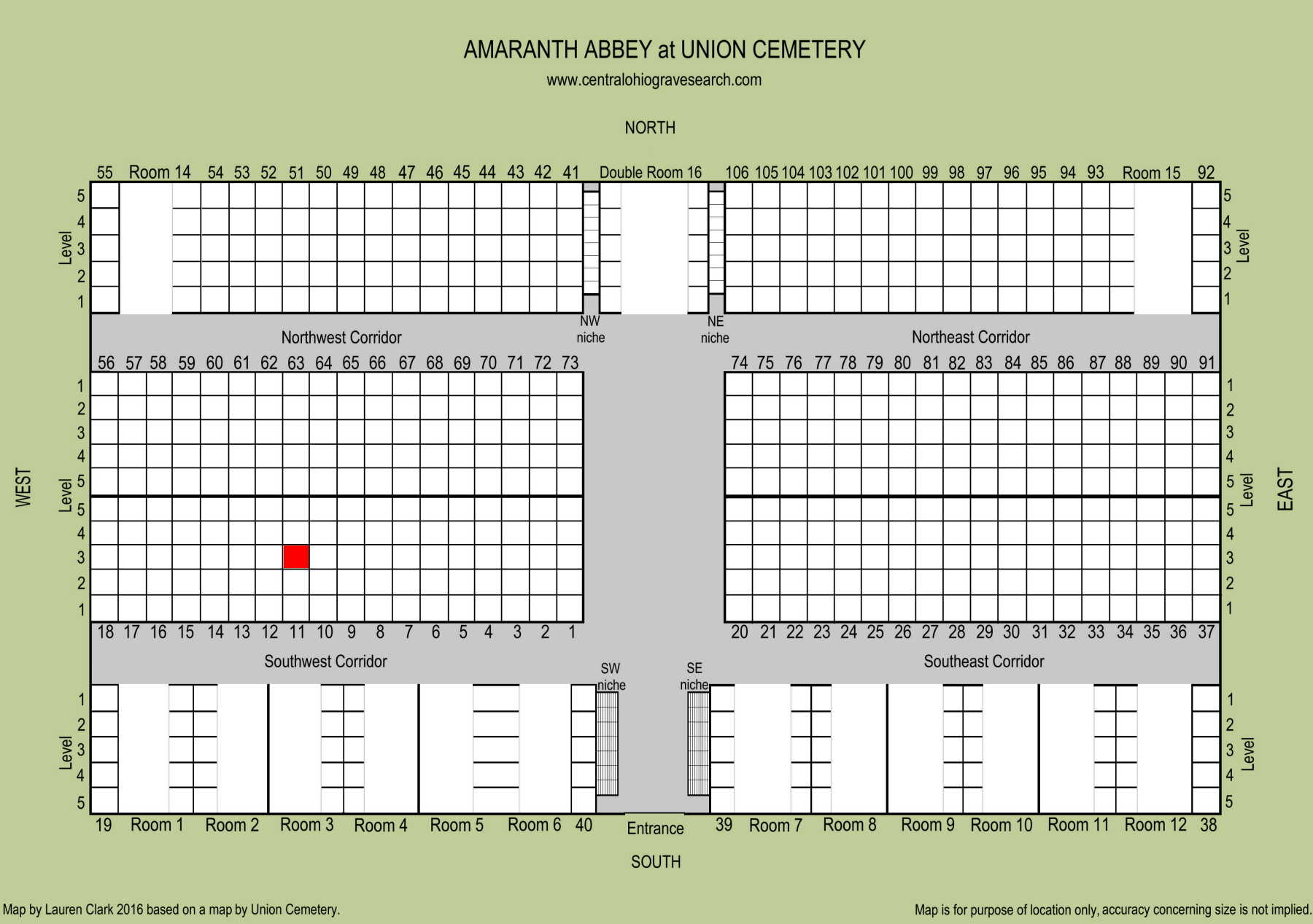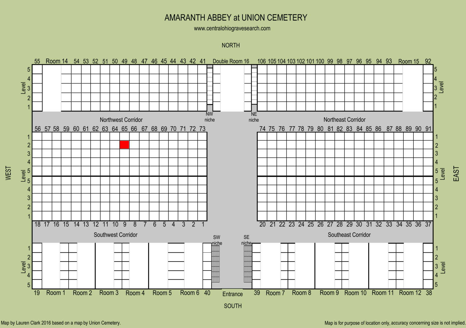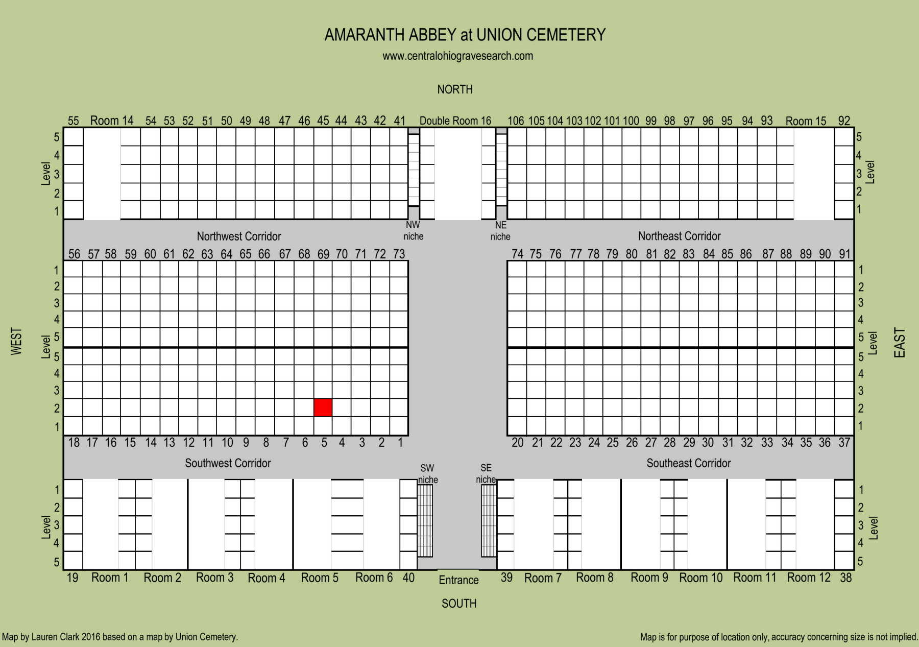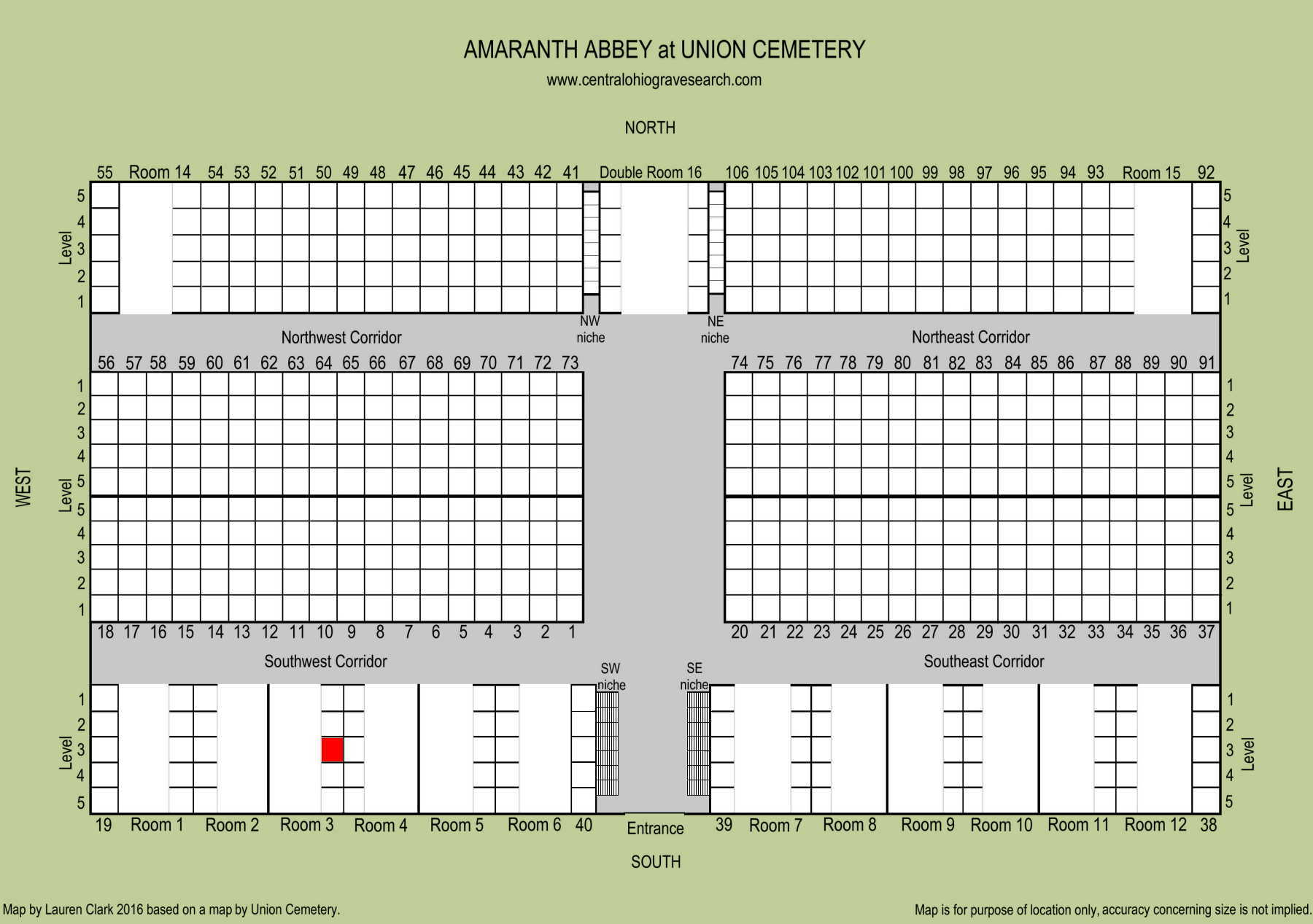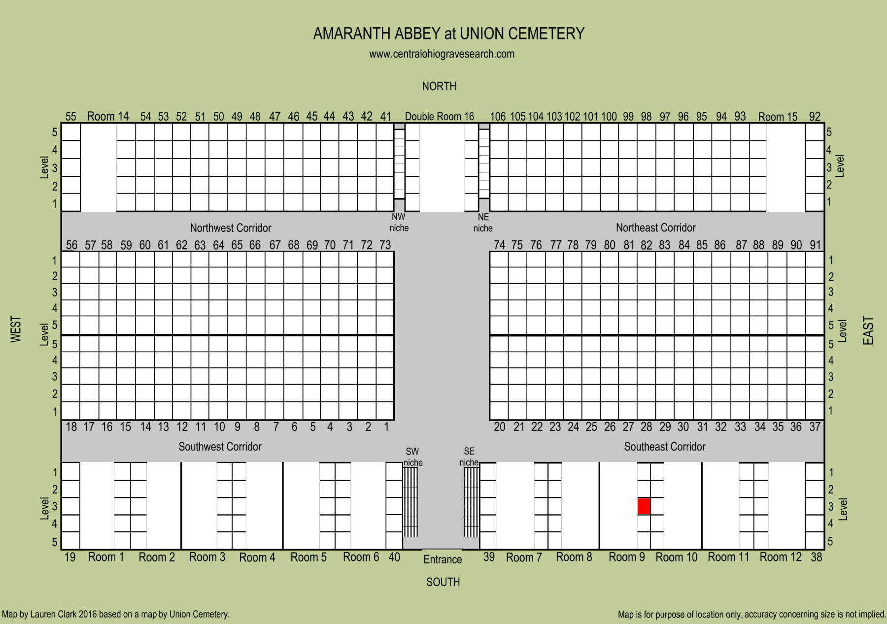 Union Cemetery Association "CIMS" computer printout of names and crypt/niche/room location for interments in Amaranth Abbey. This list represents what had been entered into the Union Cemetery office computer program as of 03 Nov 2014. This source is cited as Nov 2014 printout.
