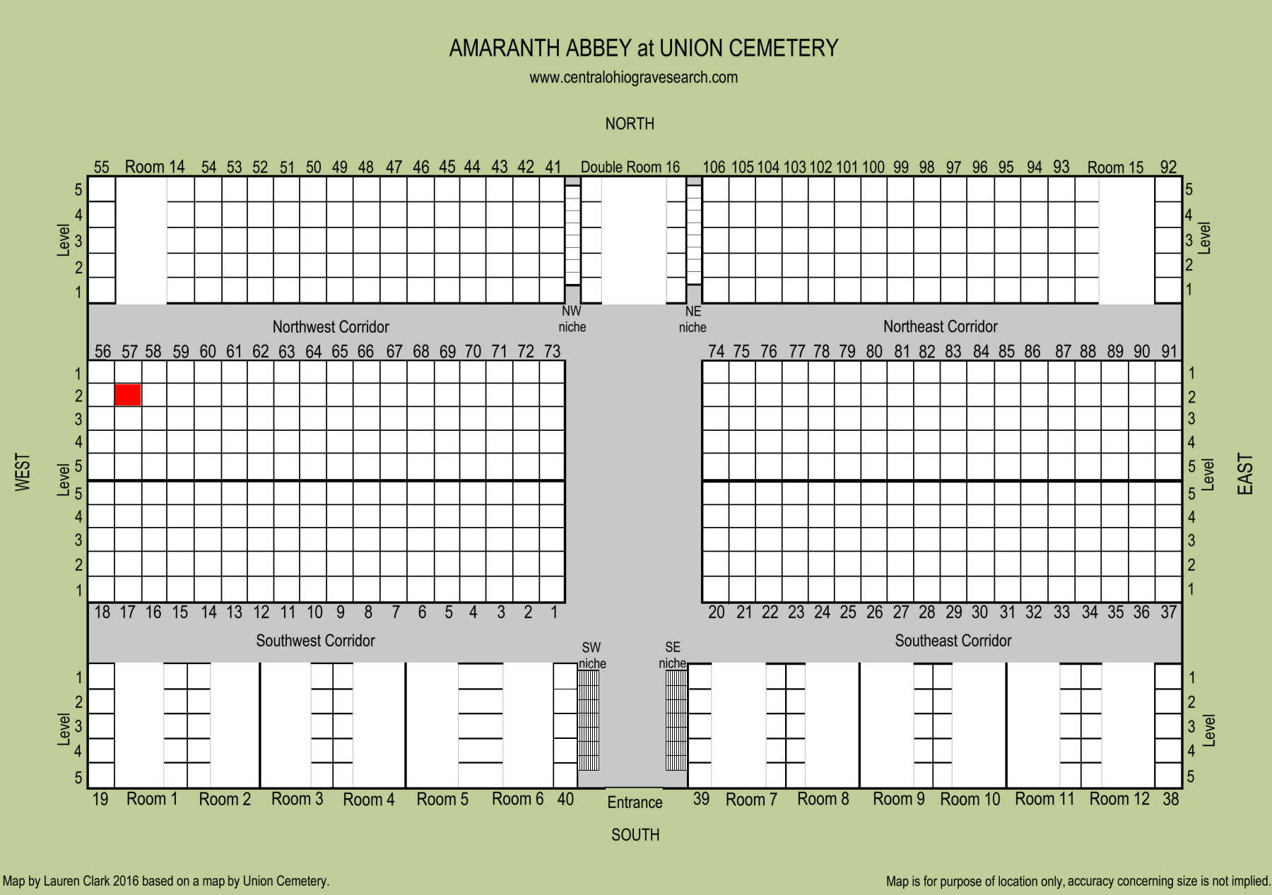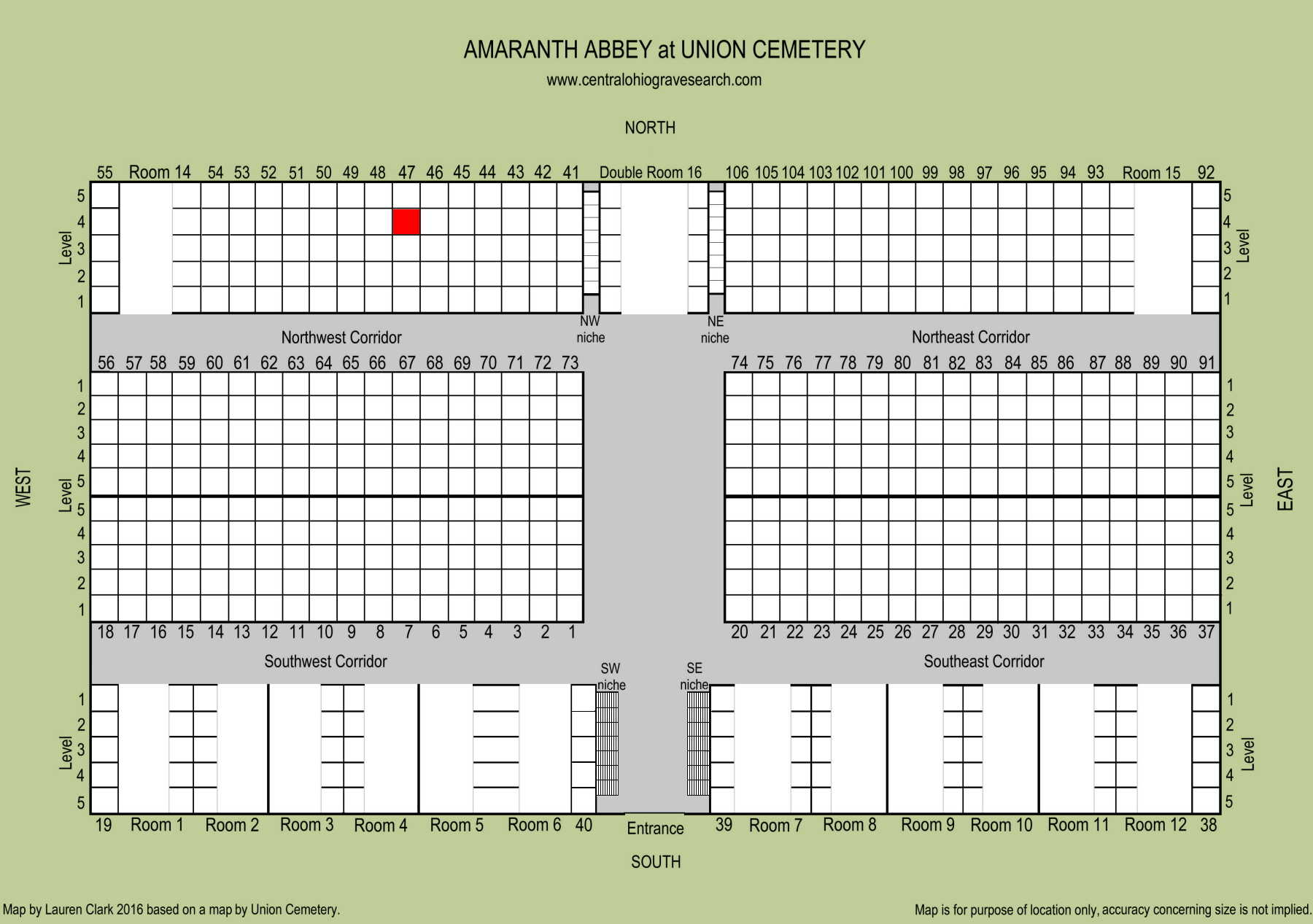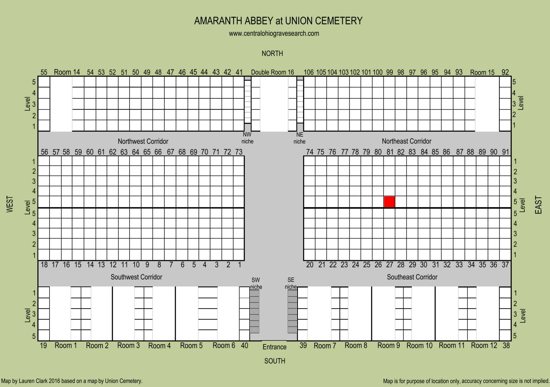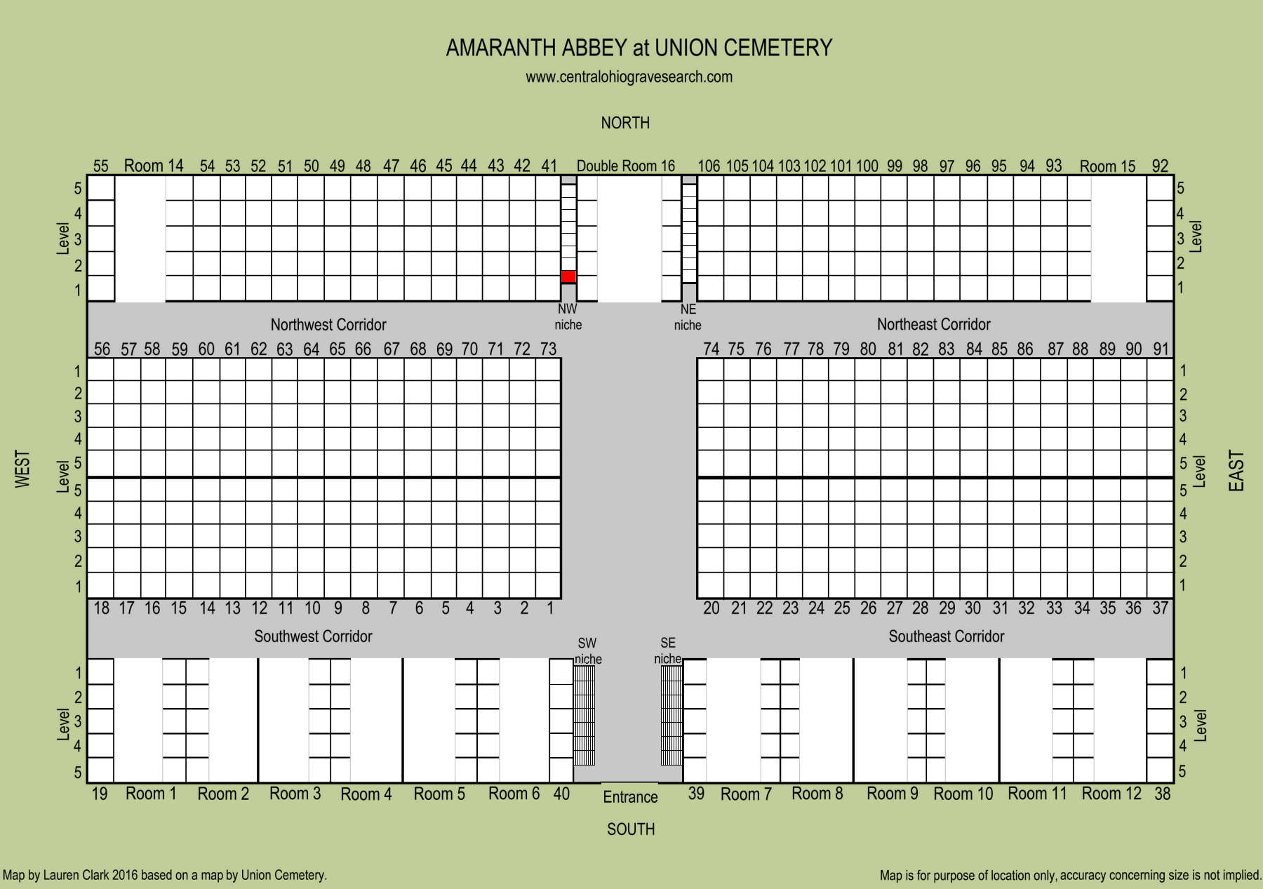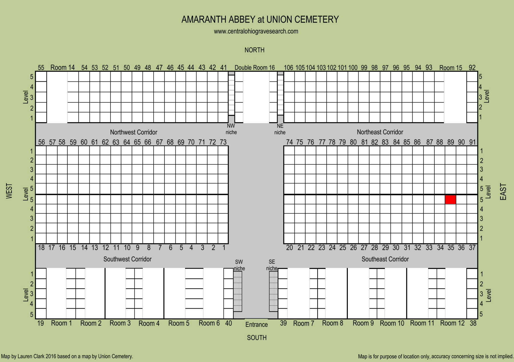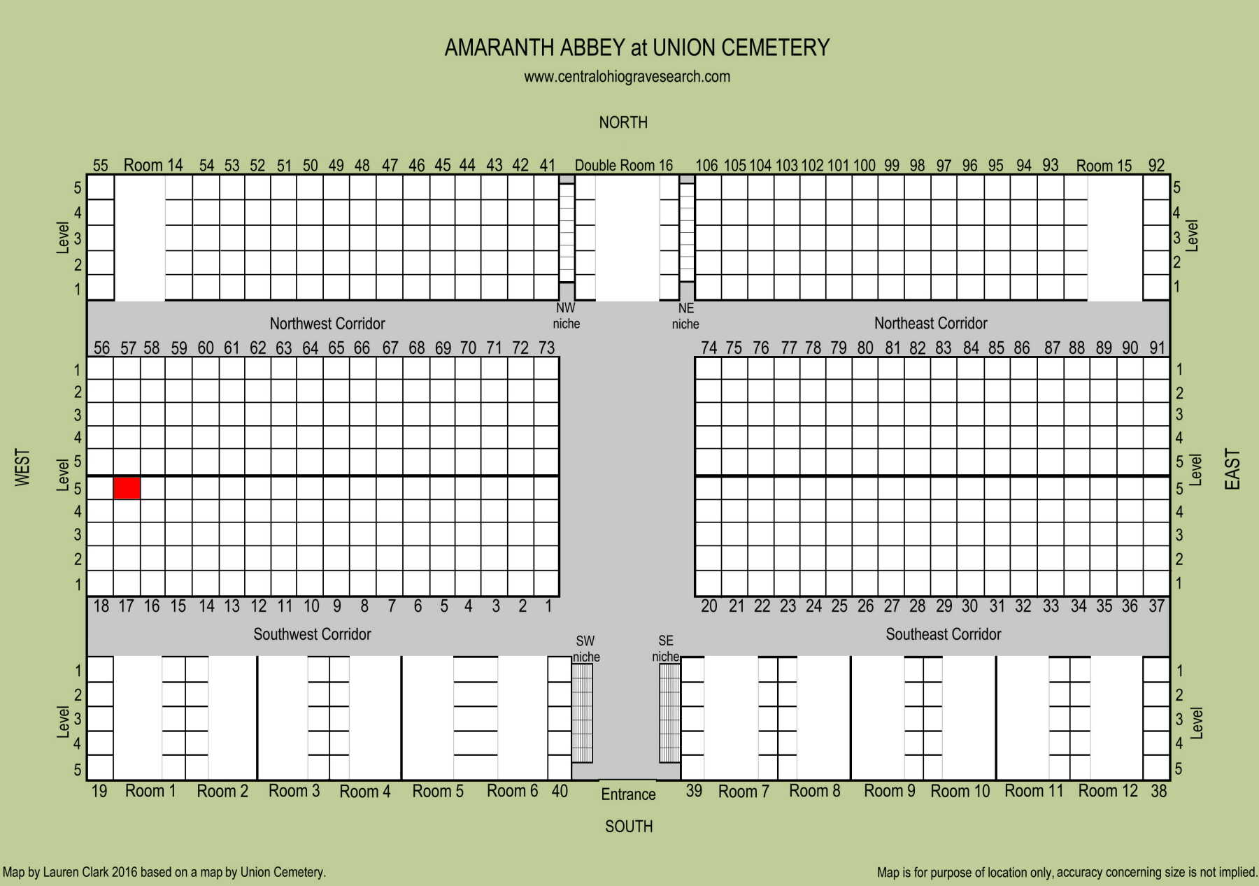 Union Cemetery Association "CIMS" computer printout of names and crypt/niche/room location for interments in Amaranth Abbey. This list represents what had been entered into the Union Cemetery office computer program as of 03 Nov 2014. This source is cited as Nov 2014 printout.
