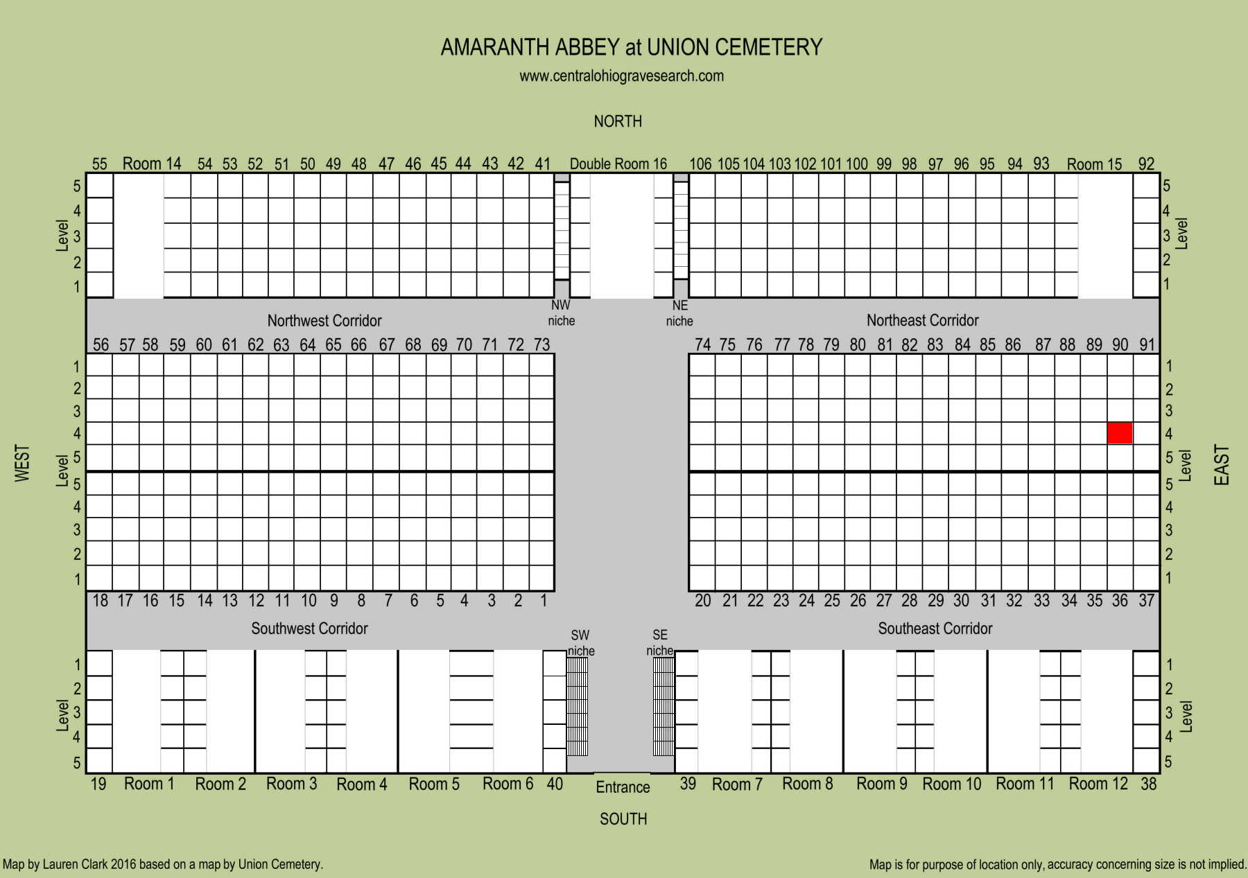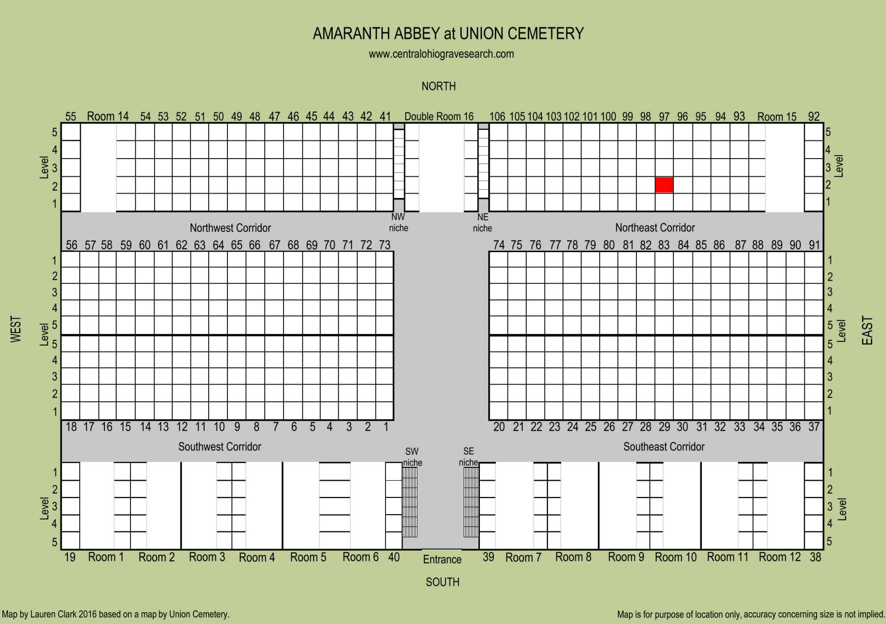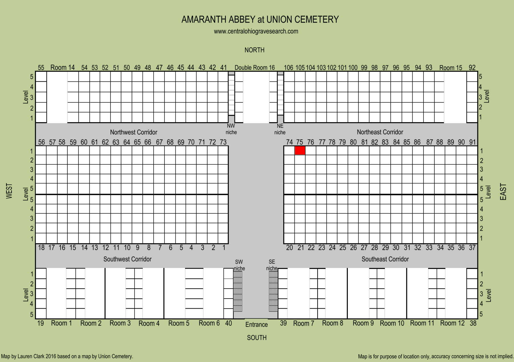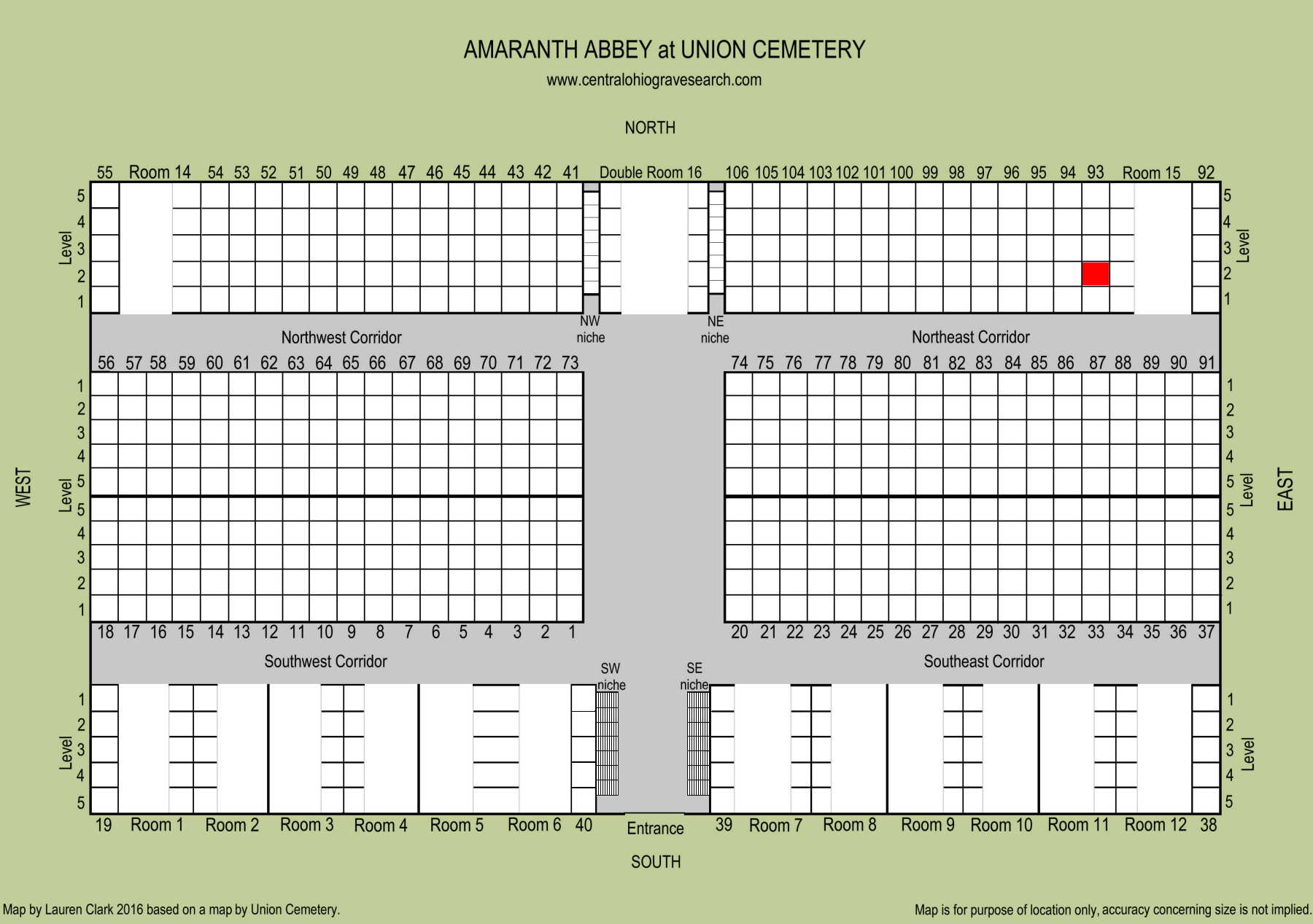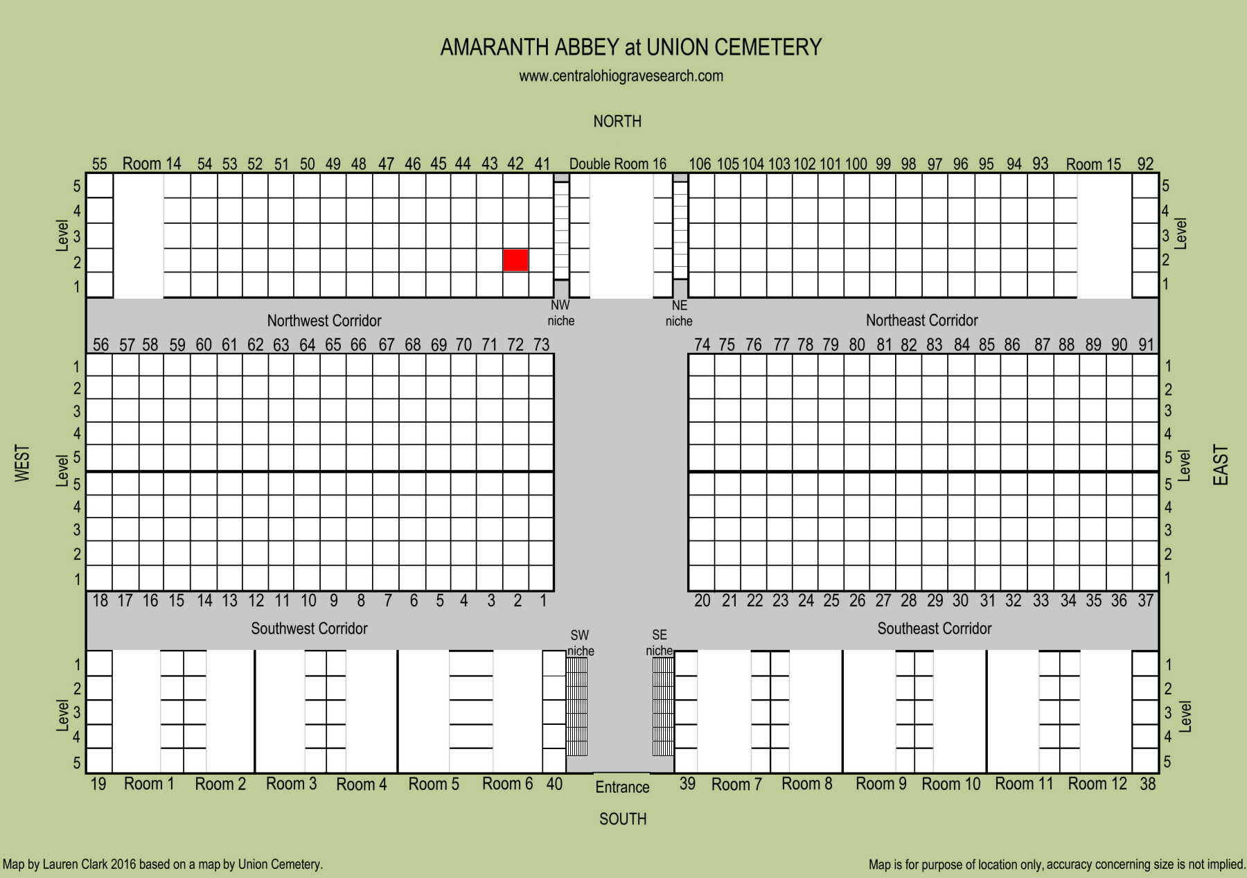 Union Cemetery Association "CIMS" computer printout of names and crypt/niche/room location for interments in Amaranth Abbey. This list represents what had been entered into the Union Cemetery office computer program as of 03 Nov 2014. This source is cited as Nov 2014 printout.