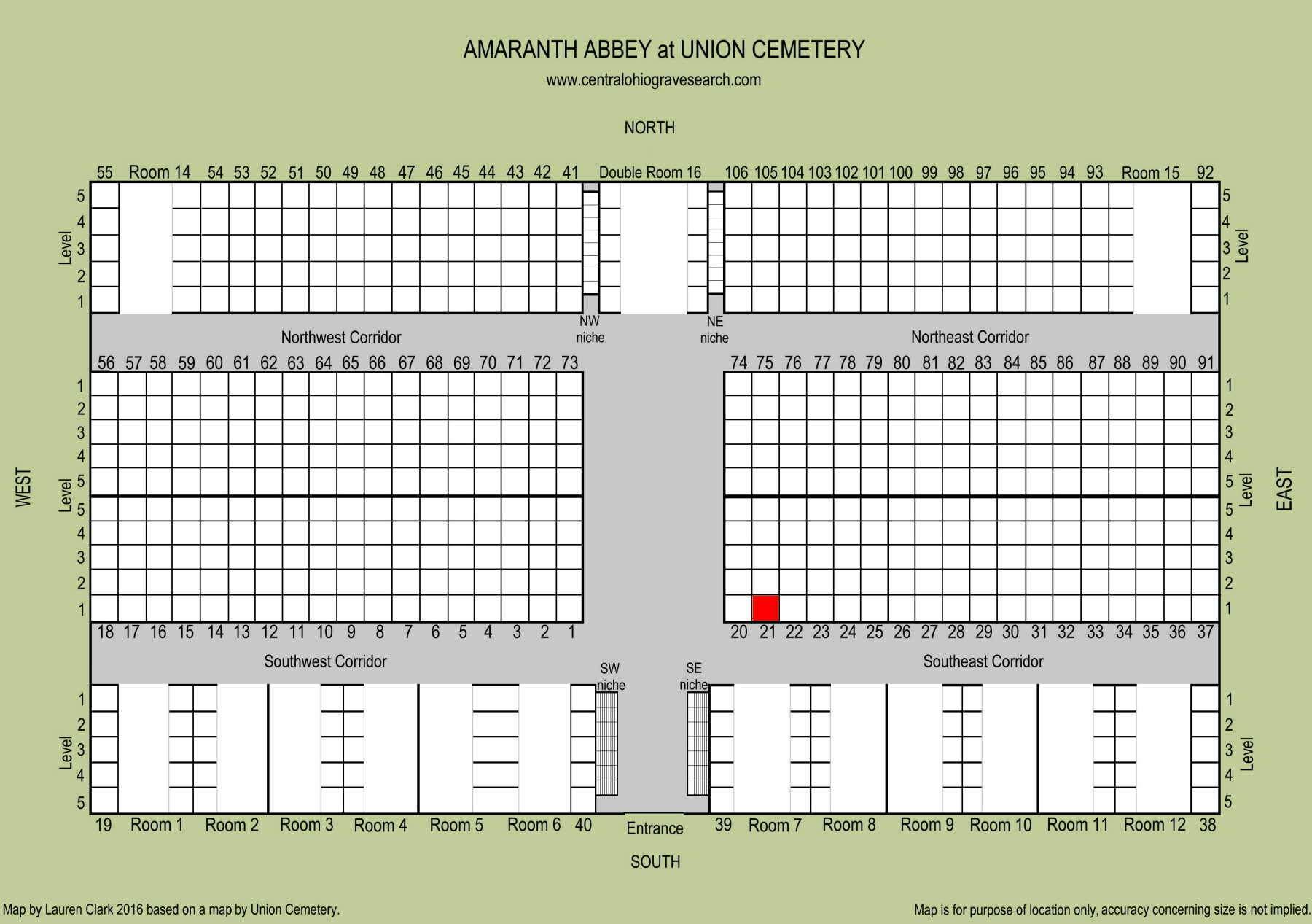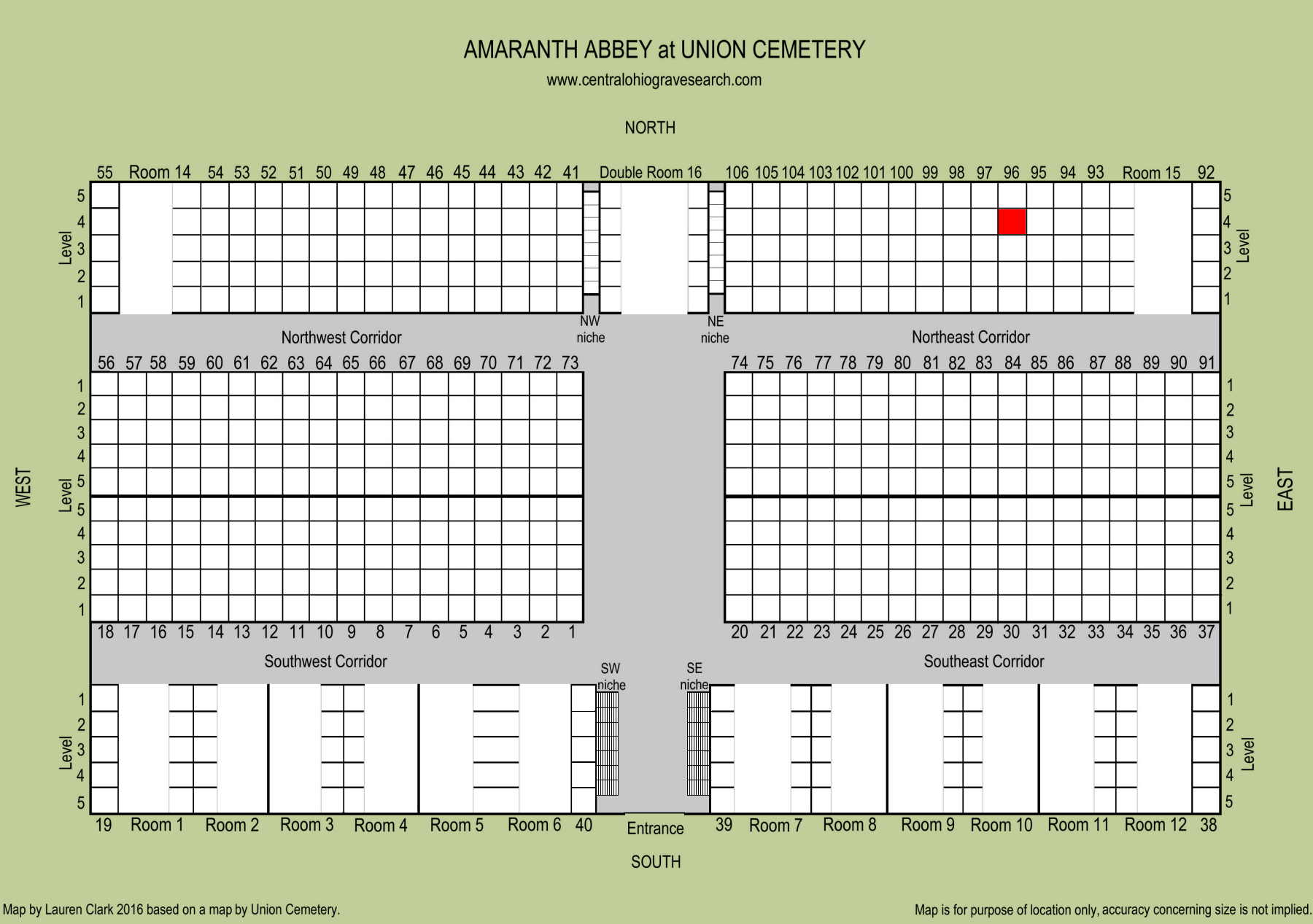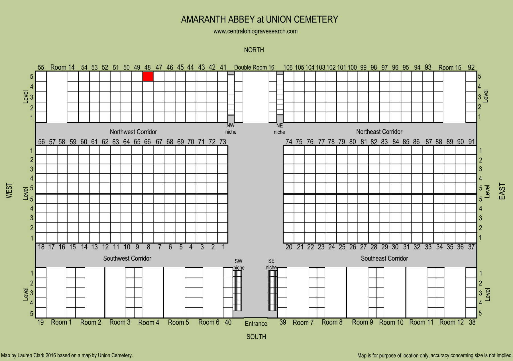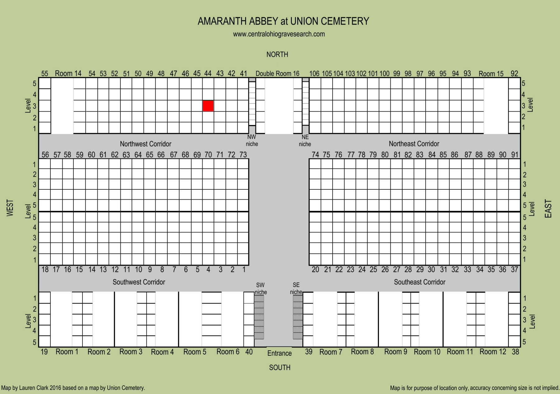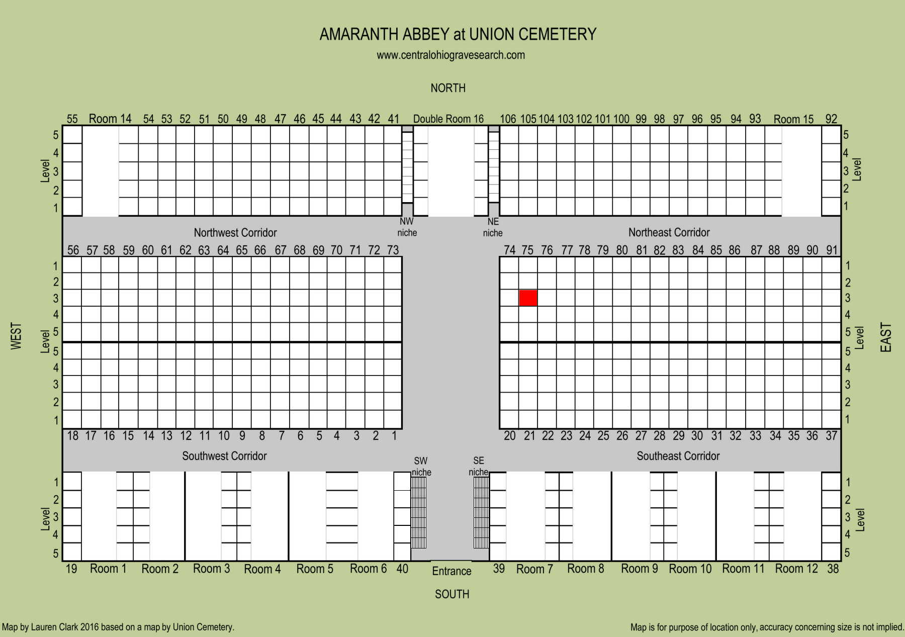 Union Cemetery Association "CIMS" computer printout of names and crypt/niche/room location for interments in Amaranth Abbey. This list represents what had been entered into the Union Cemetery office computer program as of 03 Nov 2014. This source is cited as Nov 2014 printout.