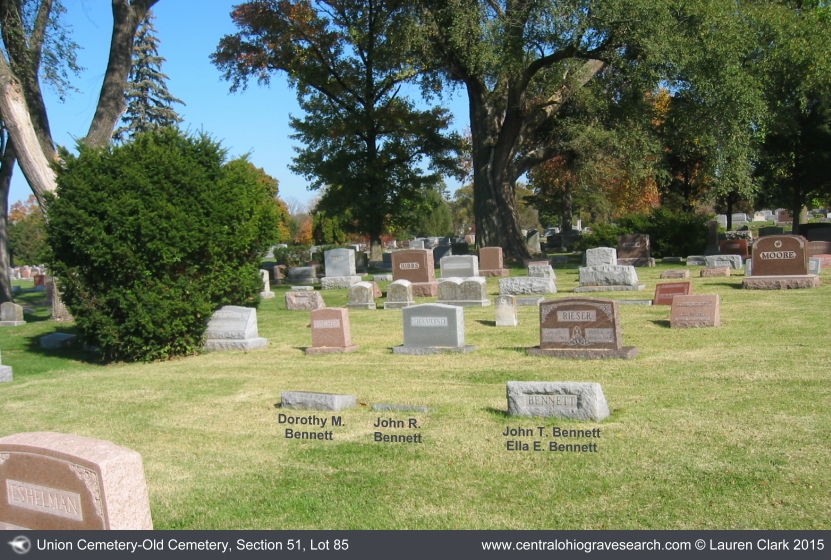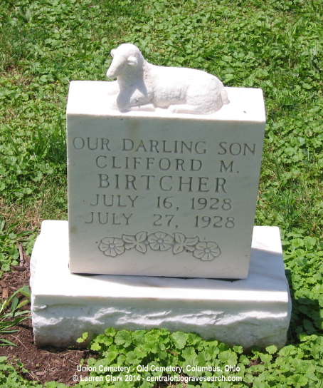 Blosser, Kenneth E. | 1920 | * 06 Jul | 1925 | Union Cemetery Association Interment Book 6, page 31, lists aged 5 years, White male, funeral home: Samuel E. Corbin in Worthington, Ohio, and indicates interred in a Lot owned by Belle J. Bacon. | Sec. NewAdd. | Lot 139 (Photo) | 1st from North, West Tier | Eastside | Map | ||
