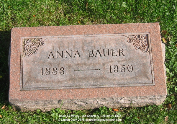 Bluhm, Anna | 18 Nov | 1886 | 20 Jun | 1964 | Interment card lists aged 77 years, last residence 1394 Sullivant Ave., date of interment 23 Jun 1964. Burials on the Web lists born in Columbus, Ohio, daughter of John Bruns & Maxine Schard | Sec. 52 | Lot 075 (Photo) | Eastside | Map | ||