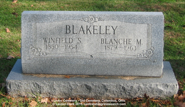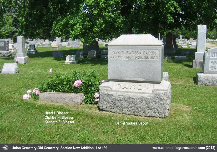 Blosser, Hazel I. | 1887 | * 28 Mar | 1938 | Union Cemetery Association Interment Order lists aged 51 years, White female, wife of E. C. Blosser (deceased) mother of Belle Bacon (deceased), last residence possibly Gates Mills, East of Cleveland, Ohio, funeral home: Samuel E. Corbin in Worthington, Ohio. | Sec. NewAdd. | Lot 139 (Photo) | 4th from South | Eastside | Map | ||