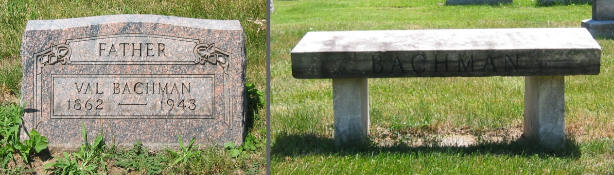 Bachman, Valentine "Val" | * 07 Jun | 1943 | Interment card lists aged 81 years, last residence 1706 S. Champion Ave. Burials on the Web lists son of Valentine Bachman & ---. [Interment card lists first name Valentine, stone is engraved Val.] | Sec. 58 | Lot 215 | Eastside | Map | ||||