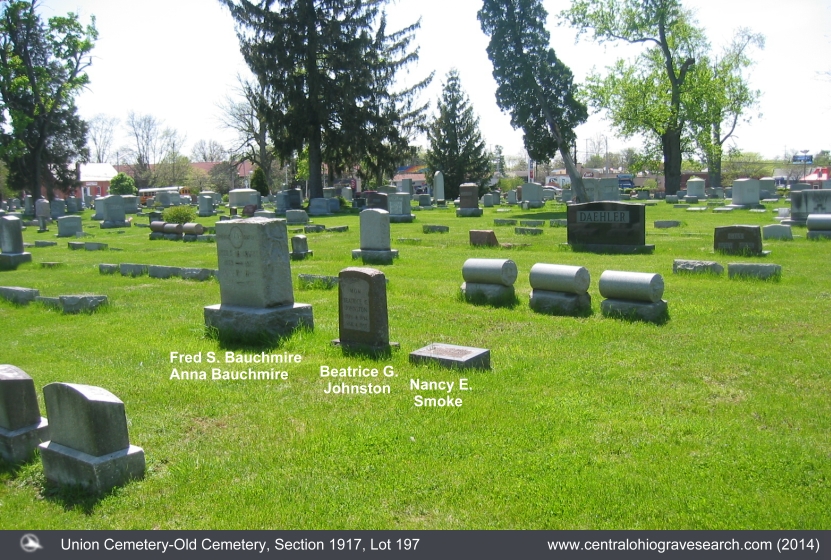 Bachman, Harriett F. | 15 Apr | 1903 | 21 Apr | 1935 | Union Cemetery Association Interment Order lists aged 32 years, White female, last residence Westerville, Ohio, R #3, funeral home: Glenn L. Myers. | Sec. 55 | Lot 011 | 2nd from South | Eastside | Map | |