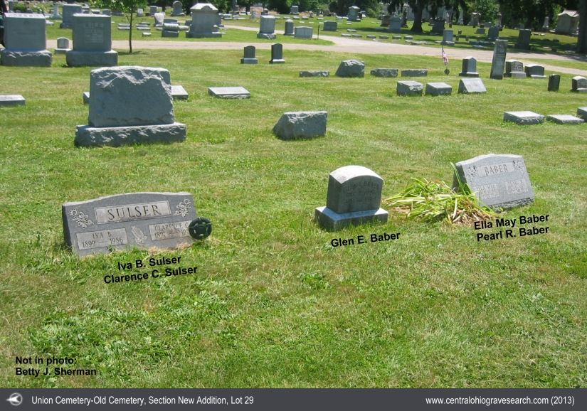 Baber, Glen E. | 02 Dec | 1896 | 10 Apr | 1909 | Union Cemetery Association Interment Book 1, page 112, lists brick vault purchased on 09 May 1909, funeral home: Goble, Section New Addition, no Lot number listed. Interment card lists aged 12 years | Sec. NewAdd. | Lot 029 (Photo) | 3rd from South | Eastside | Map | |