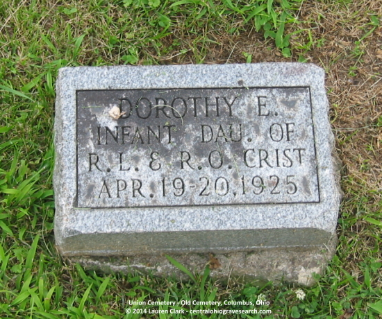 Cutherbertson, Luella Ellen | * 22 Nov | 1919 | Union Cemetery Association Interment Book 4, page 54, lists aged 11 months, funeral home: Schoedinger Co. | Sec. 1915 | Lot 095 (Photo) | 6th from North, East Tier | Eastside | Map | |||