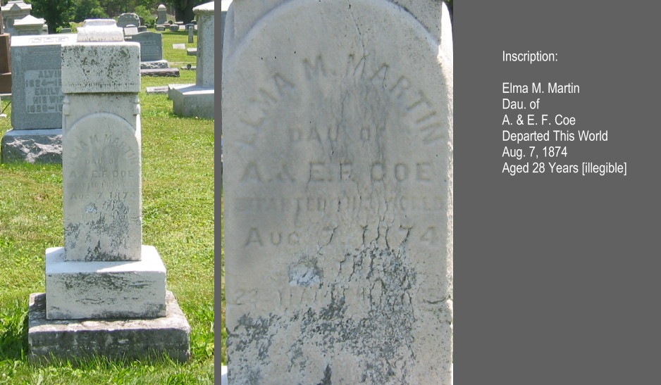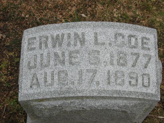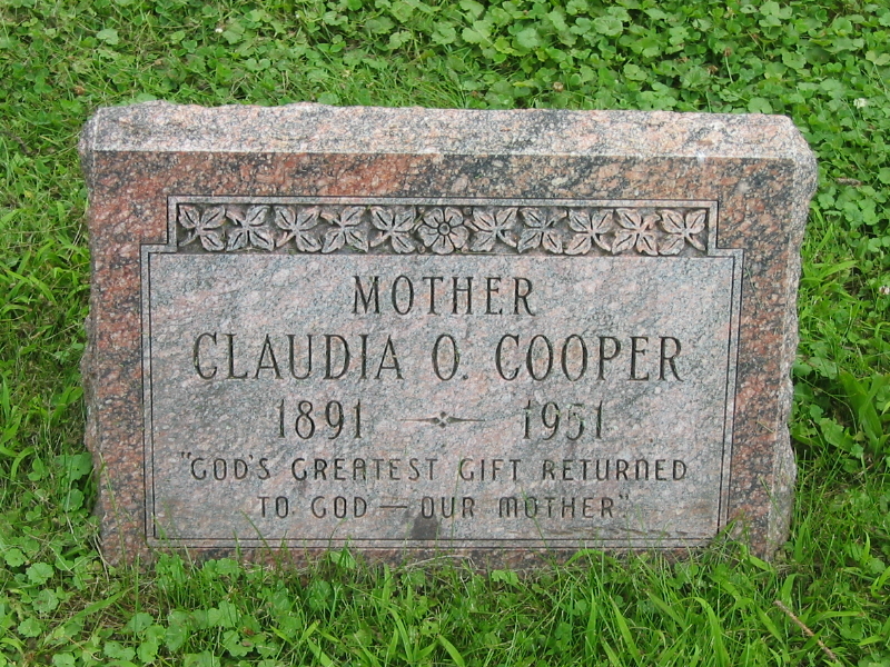 Coate, Alma D. Slowter | 1892 | * 16 Jun | 1919 | Gravestone indicates wife of B. W. Coate. Union Cemetery Association Interment Book 4, page 9, lists aged 27 years, funeral home: H. A. Pletcher. | Sec. 1917 | Lot 269 (Photo) | 3rd from North | Eastside | Map | ||