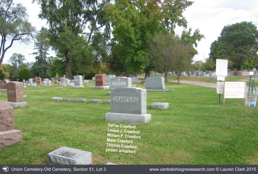 Cochenour, Effie | 1884 | * 28 Jul | 1939 | Union Cemetery Association Interment Order lists aged 55 years, White female, daughter of Daniel Foor, wife of Earl Cochenour, last residence 553 Deshler Ave., funeral home: Noble Allen. | Sec. 29 | Lot 007 | 4th from South | Eastside | Map | ||