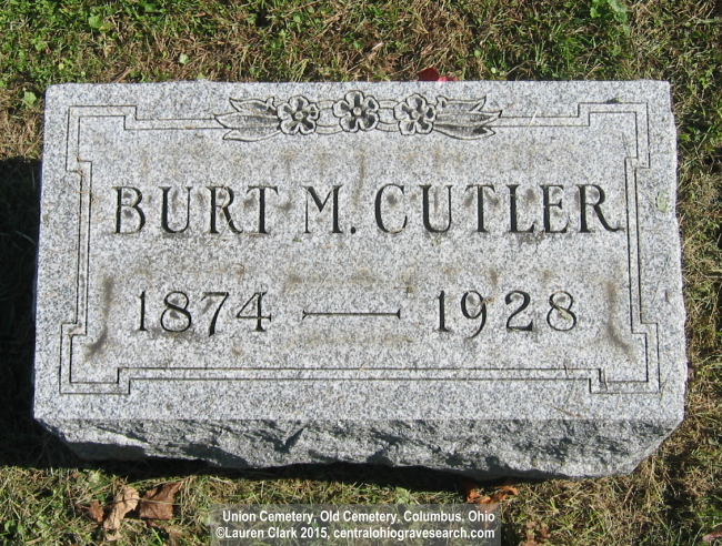 Cutler, Burt M. | 1874 | * 04 Jul | 1928 | Union Cemetery Association Interment Book 7, page 129, lists aged 53 years, White male, funeral home: Denton and Donaldson. | Sec. 51 | Lot 026 (Photo) | 2nd from South | Eastside | Map | ||