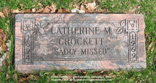 Cochran, Augusta | 1896 | 1923 | Union Cemetery Association Interment Book 5, page 240, lists aged 27 years, White female, funeral home: Edward E. Fisher Co. [Interment Book lists date of burial 09 Feb 1924, stone is engraved year of death 1923.] | Sec. 1917 | Lot 892 (Photo) | 6th from South | Eastside | Map | |||