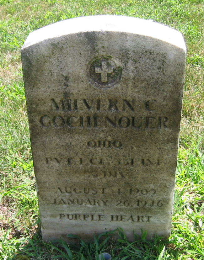 Cochenouer, Milvern C. | 04 Aug | 1909 | 26 Jan | 1946 | Military marker: MILVERN C. COCHENOUER, OHIO, PVT 1 CL 331 INF, 83 DIV, AUGUST 4, 1909 - JANUARY 26, 1946, PURPLE HEART. | Sec. 58 | Lot 292 | Eastside | Map | ||