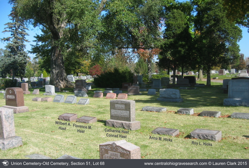 Haag, Daisey B. | * 05 Feb | 1937 | Union Cemetery Association Interment Order lists aged 63 years, White female, daughter of David B. Buszby & Barber (sic.) Hillard, wife of Edward Haag, last residence 5539 Olentangy River Rd., funeral home: E. C. Annen Co. An obituary from unknown newspaper attached to the Interment Order lists survived by husband Edward Haag and oen son, George A. Reams. | Sec. 64 | Lot 074 | 1st on South | Eastside | Map | |||