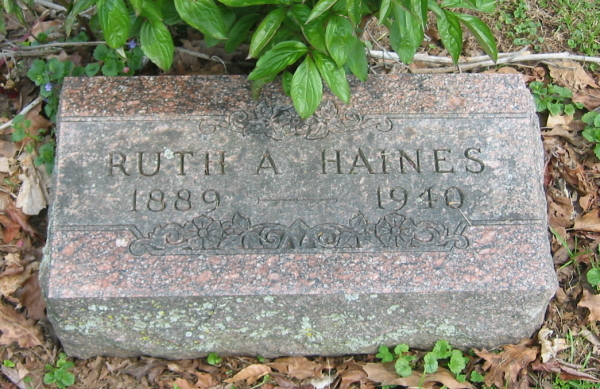 Haag, Ruth E. | 31 Oct | 1910 | 30 Nov | 1910 | Gravestone indicates daughter of L. W. & F. H. Haag. Union Cemetery Association Interment Book 1, page 146, lists aged 1 month, funeral home: Schoedinger. [Interment Book lists date of burial 26 Dec 1910, stone is engraved date of death 26 Nov 1910.] | Sec. Old | Lot 434 (Photo) | Eastside | Map | ||