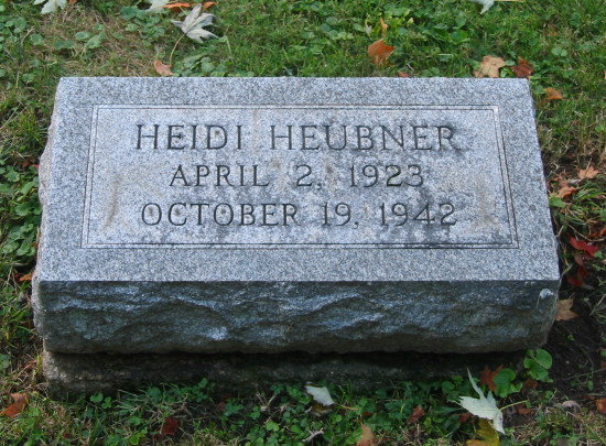 Heubner, Adelheid "Heidi" | 02 Apr | 1923 | 19 Oct | 1942 | Interment card lists aged 19 years, last residence Richmond Indiana. [Interment card lists name Adelheid, stone is engraved Heidi] | Sec. 1915 | Lot 110 (Photo) | Eastside | Map | ||