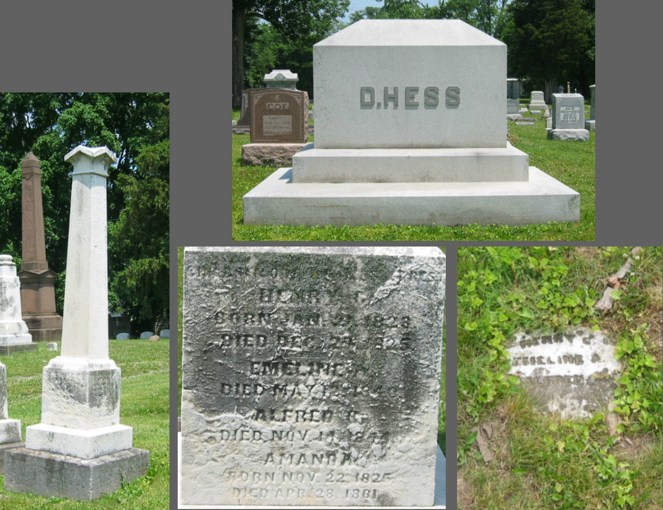 Hess, James Hermes | 21 Aug | 1839 | 13 Feb | 1889 | Gravestone indicates husband of Eliza Jane Hess. Union Cemetery Association Hess Book, page 68, lists "James Hess" put in the vault on 15 Feb 1889. There is no location listed in the Hess Book entry. His gravestone is located on Lot 189 in Section Old. Burials on the Web lists son of John Moses Hess Sr. & Elizabeth Grayless. | Sec. Old | Lot 189 (Photo) | Eastside | Map | ||