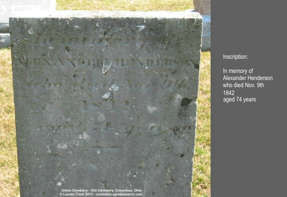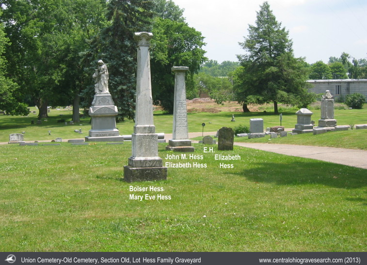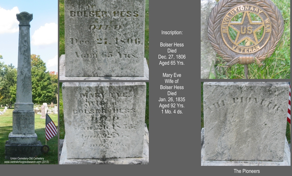 Hess, George Bolser or Balser | 25 Mar | 1747 | 27 Dec | 1806 | **Oldest Burial in the Cemetery ** Gravestone indicates wife of Mary Eve Hess, aged 65 years. Revolutionary War veteran flag holder. Burials on the Web lists aged 59 years, born in York, son of Casper & Marie Eve Hess, husband of Mary Eve Hensel Hess, died in Columbus, Ohio. Burials on the Web lists children: Daniel, Mary Ann, George Bolser II, Mary Eve, Cathrine, Saloma, Elizabeth, Susan, & John Moses. [Burials on the Web lists name George Balser Hess, stone is engraved Bolser Hess. Interment card lists name Bolser Hess. An article in the Columbus Dispatch by Ed Lentz, 05 Aug 1996, indicates born in Germany.] There is no written record other than the gravestone reading regarding this individual in Union Cemetery Association records. Records begin after the Union Cemetery Association was formed in 1879. | Sec. Old | Lot Hess (Photo) | Eastside | Map | ||