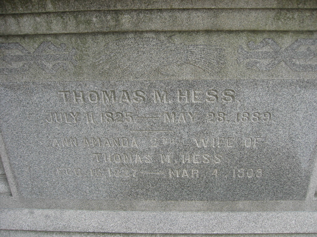 Hess, Thomas Moore | 11 Jul | 1825 | 28 May | 1889 | Gravestone indicates husband of Ann Amanda Hess. Union Cemetery Association Griffith Book, page 2, lists "Thomas M. Hess" put in the vault on 31 May 1889, taken out [date obscured due to page disintegration] 1889. There is no location listed in the Griffith Book entry. His gravestone is on Lot 48 in Section Old. Burials on the Web lists son of John Moses Hess Sr. & Elizabeth Moore. Union Cemetery Association Minutes indicates Thomas M. Hess served as Superintendent of the vault & cemetery grounds from April 1881 until his death. [Burials on the Web lists date of birth 25 Jul 1825, stone is engraved 11 Jul 1825] | Sec. Old | Lot 048 (Photo) | Eastside | Map | ||