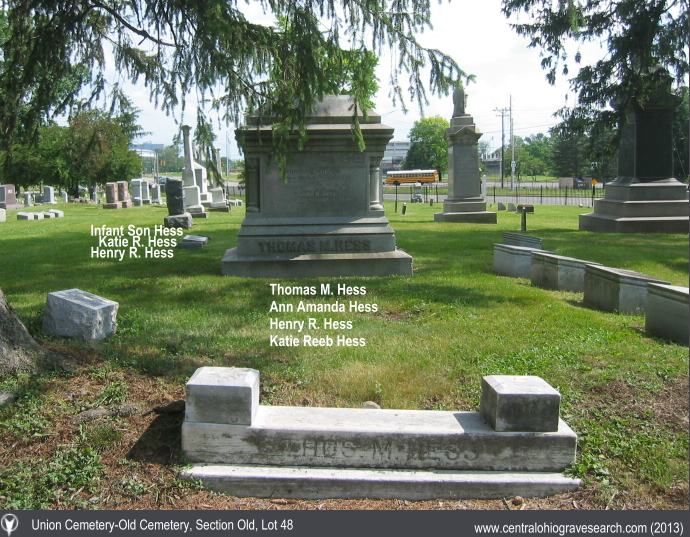 Hess, Katie Reeb | 08 Nov | 1857 | 22 Jun | 1890 | Union Cemetery Association Interment Book 7, page 166, lists aged 33 years, White female, funeral home: P. E. Rutherford Co., and indicates moved from Green Lawn Cemetery to Union Cemetery on 15 Oct 1928, held in the Union Cemetery receiving vault until 16 Oct 1928, and indicates interred in a Lot owned by Thomas Hess. | Sec. Old | Lot 048 (Photo) | 2nd from South | Eastside | Map | |