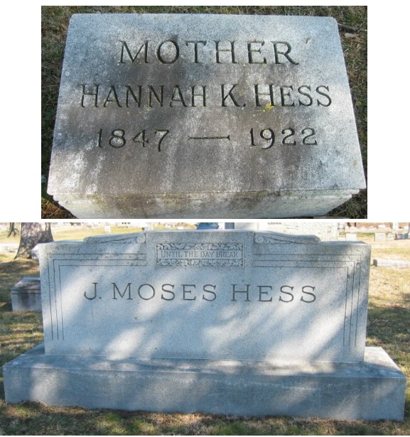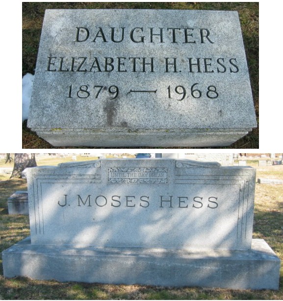 Hess, John Moses | 26 Jul | 1856 | Gravestone indicates husband of Elizabeth Hess, aged 56 years, 10 months, 24 days. Burials on the Web listed son of George Bolser Hess & Mary Eve Hensel. This information was listed on the Burials on the Web in late 2012/early 2013, but the listing was removed as of June 2013. There is no information regarding this individual in Union Cemetery Association records. Records begin after the Union Cemetery Association was formed in 1879. Between 1879-1905, records for individual burials are incomplete. | Sec. Old | Lot Hess (Photo) | Eastside | Map | ||||
