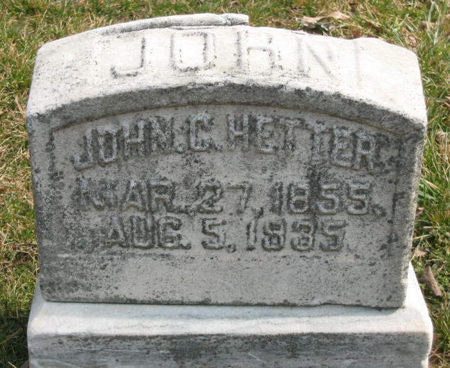 Hetter, Margaret | 25 May | 1857 | 03 Apr | 1903 | Gravestone indicates wife of J. C. Hetter. Union Cemetery Association Griffith Book, page 108, lists brick vault purchased for "Mrs. Herrett," Section Old, no Lot number listed, on 05 Apr 1903. There is a notation in pencil [made at a later date] indicating see marker on Lot 55, Section Old. Based on the date and location, this entry appears to refer to Margaret Hetter. Griffith Book See Herrett, Mrs. | Sec. Old | Lot 055 (Photo) | Eastside | Map | ||