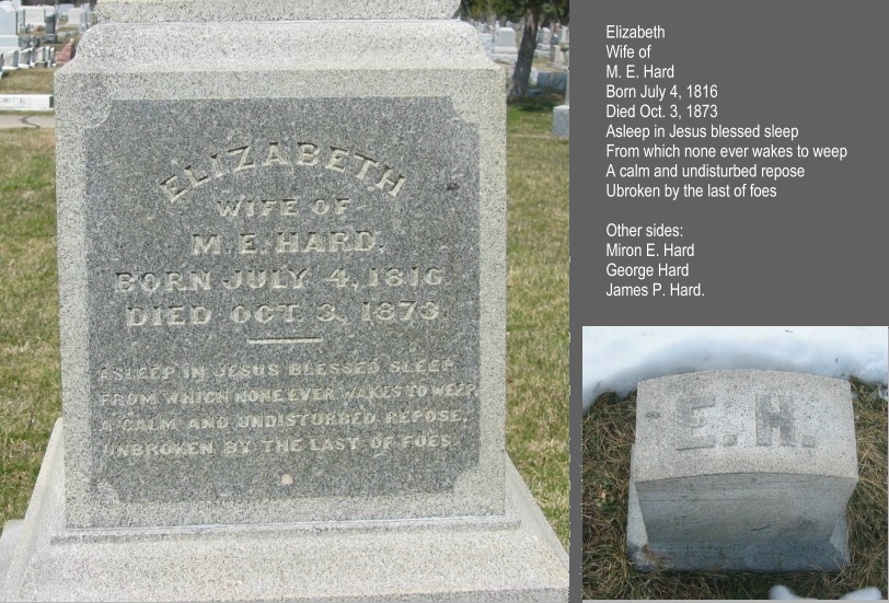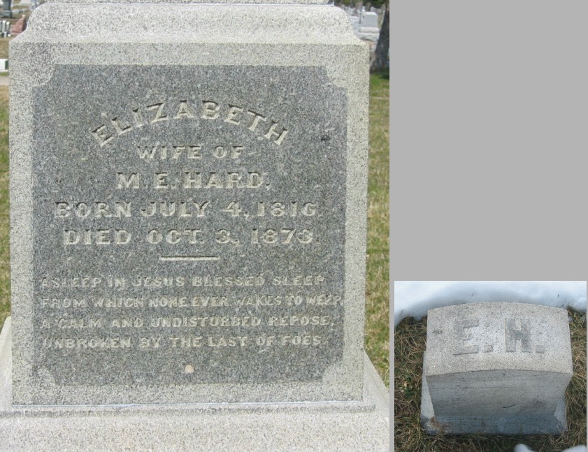 Hess, Sarah Gordon | 13 Feb | 1801 | 05 Jan | 1873 | Gravestone indicates wife of Daniel Hess, aged 71 years, 10 months, 22 days. There is no information regarding this individual in Union Cemetery Association records. Records begin after the Union Cemetery Association was formed in 1879. Between 1879-1905, records for individual burials are incomplete. | Sec. Old | Lot 016 (Photo) | Eastside | Map | ||