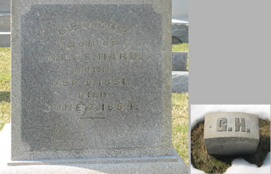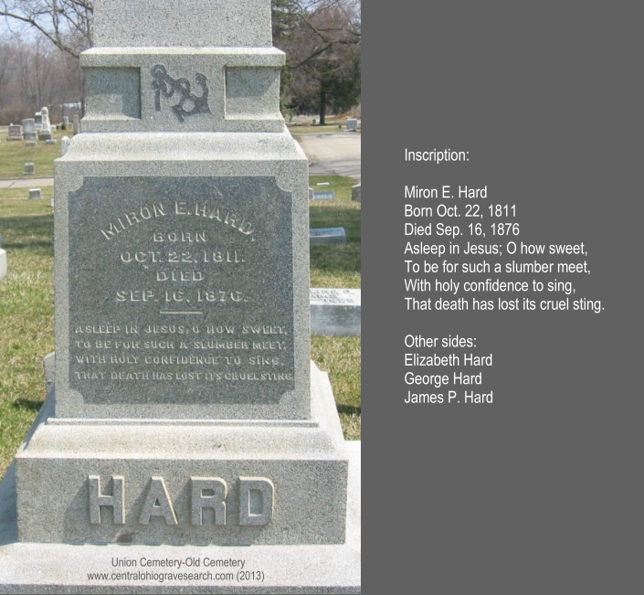 Hess, Henry G. | 21 Jan | 1823? | 29? Dec | 1825? | Interment card lists aged 7 years. There is no information regarding this individual in Union Cemetery Association records. Records begin after the Union Cemetery Association was formed in 1879. Between 1879-1905, records for individual burials are incomplete. Burials on the Web lists born in Franklin County, Ohio, child of Daniel Hess & Sarah Gordon, died in Franklin County, Ohio. [Burials on the Web lists 1820-1827; stone appears to be engraved 1823-1825] | Sec. Old | Lot 016 (Photo) | Eastside | Map | ||