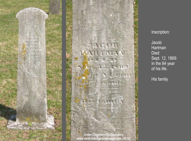 Hess, Mary Eve Hensel | 22 Jan | 1763 | 26 Jan | 1835 | Gravestone indicates wife of Bolser Hess, aged 92 years, 1 month, 4 days. Burials on the Web lists aged 92 years, wife of George Balser Hess, died in Columbus, Ohio. There is no information regarding this individual in Union Cemetery Association records. Records begin after the Union Cemetery Association was formed in 1879. Between 1879-1905, records for individual burials are incomplete. | Sec. Old | Lot Hess (Photo) | Eastside | Map | ||