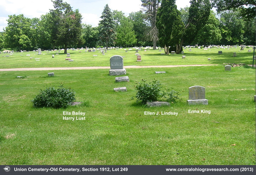 | Lill, Anna M. | 1847 | * 07 Jan | 1913 | Union Cemetery Association Interment Book 2, page 111, lists aged 66 years, funeral home: Fisher | Sec. 1912 | Lot 137 (Photo) | 2nd from South | Eastside | Map | ||