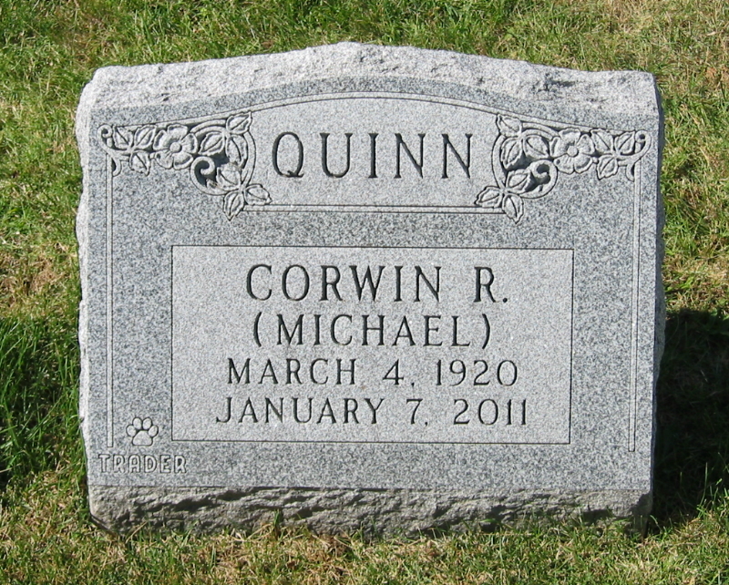 | Quinn, Corwin R. "Michael" | 04 Mar | 1921 | 07 Mar | 2011 | Gravestone has the emblem of a pawprint with the word Trader below it. Interment card lists aged 90 years, last residence 340 W. 2nd Ave. [Interment card lists date of death 07 Mar 2011, interment card lists date of burial 12 Jan 2011] | Sec. 59 | Lot 109 | Eastside | Map | ||