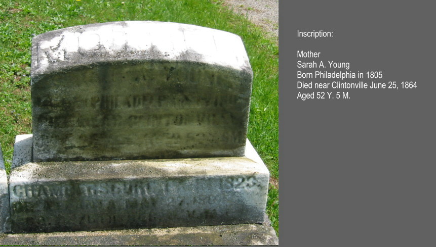 | Young, Sarah A. | 1805 | 1857 | Gravestone indicates born in Philadelphia, died near Clintonville, aged 52 years, 5 months. There is no information regarding this individual in Union Cemetery Association records. Records begin after Union Cemetery Association was formed in 1879. Between 1879-1905, records for individual burials are incomplete. | Sec. Old | Lot 423 (Photo) | Eastside | Map | ||||