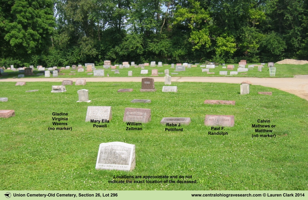 | Zuccaro, Clara Elizabeth | 1884 | * 12 Nov | 1926 | Union Cemetery Association Interment Book 6, page 266, lists aged 42 years, White female, funeral home: Miller & O'Brien in Mt. Vernon, Ohio. | Sec. 1917 | Lot 1028 (Photo) | 1st from North | Eastside | Map | ||